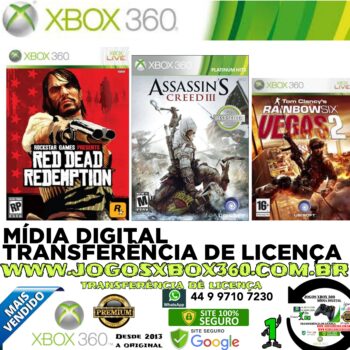 - ASSASSINS CREED 3 DUBLADO + Red Dead Redemceptiom + Vegas 2 jogo Xbox 360 Transferência de Licença Mídia Digital